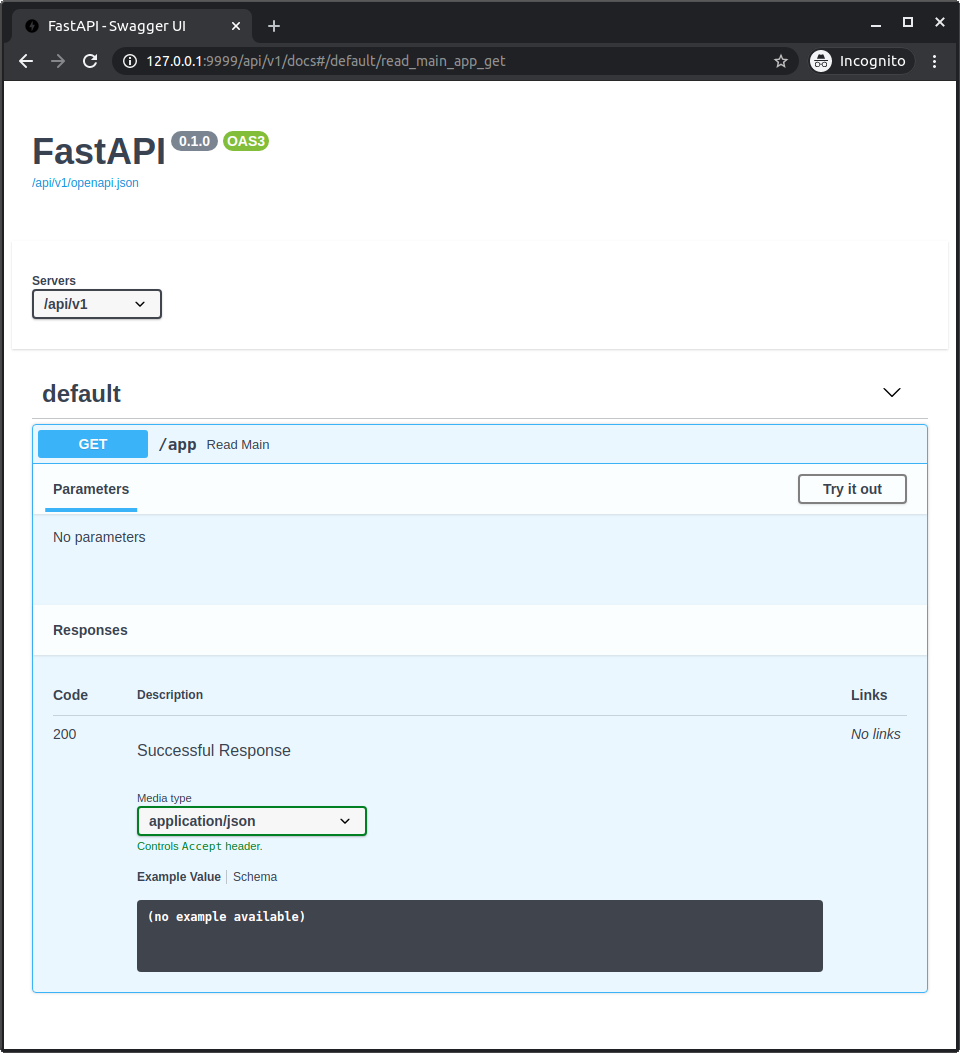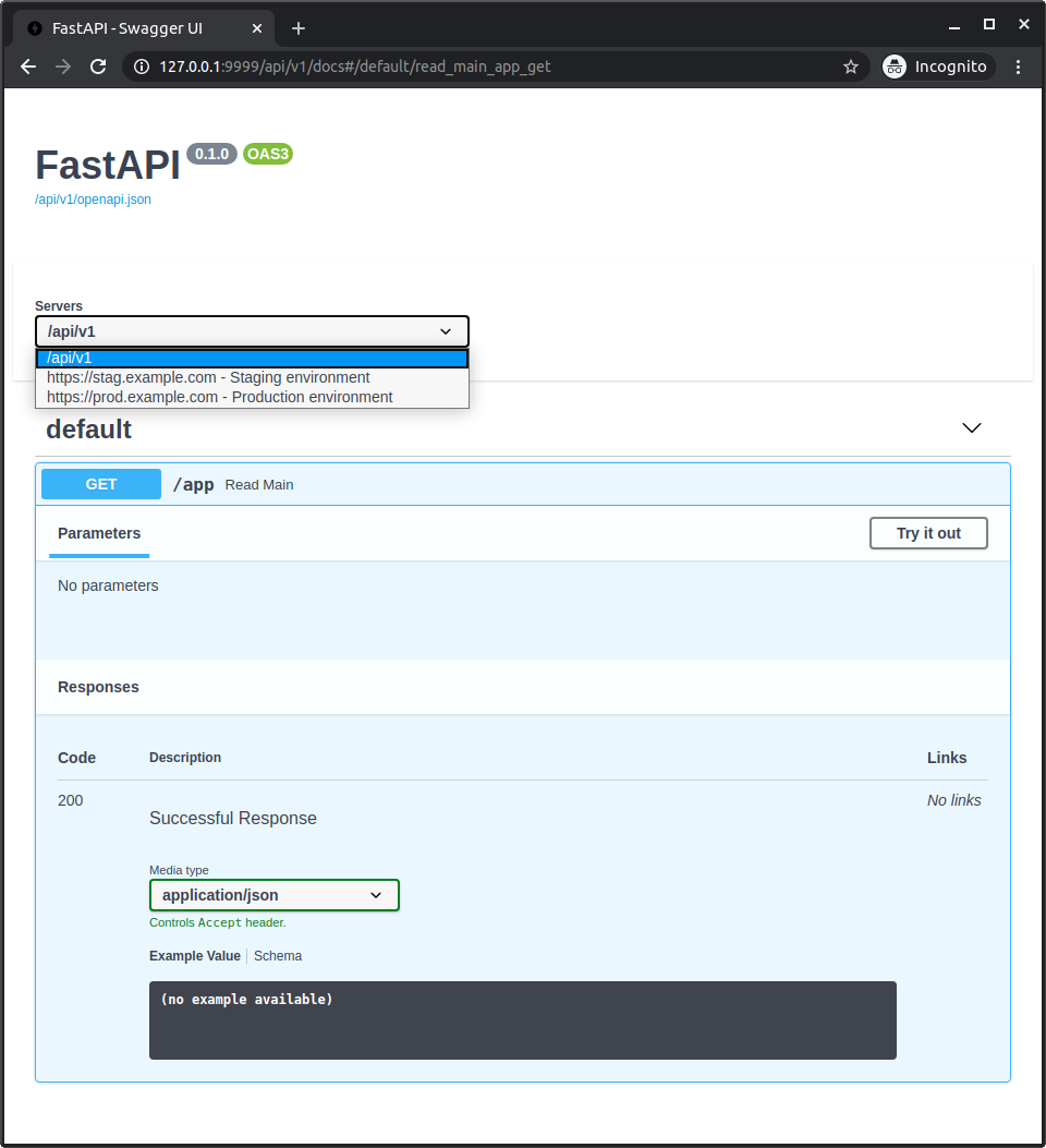 API 文档还需要 OpenAPI 概图声明 API server 位于 /api/v1(使用代理时的 URL)。例如: